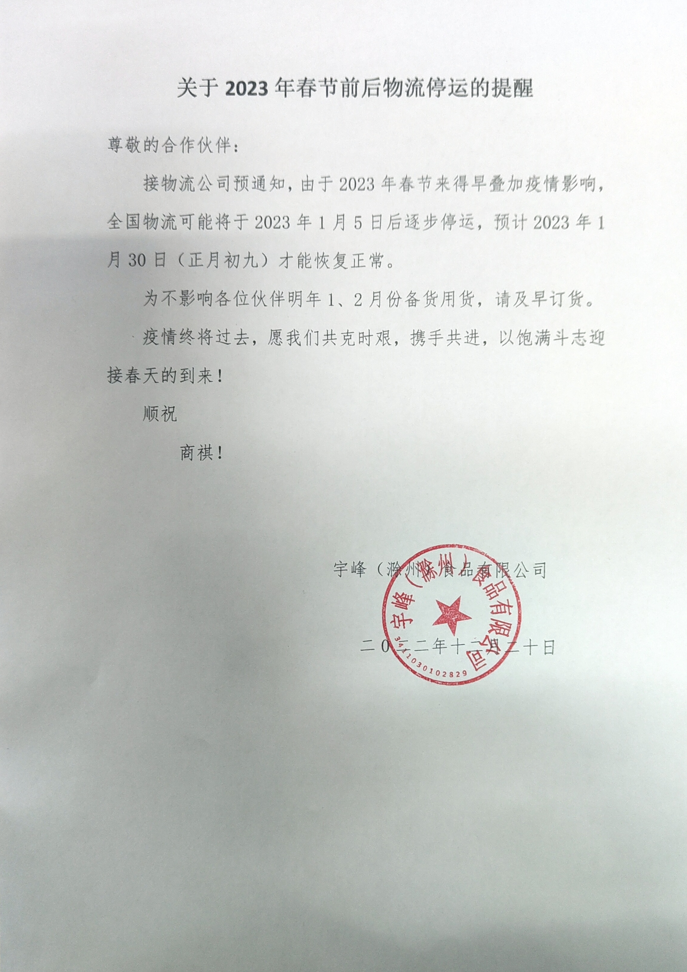 關(guān)于2023年春節(jié)前后物流停運的提醒
